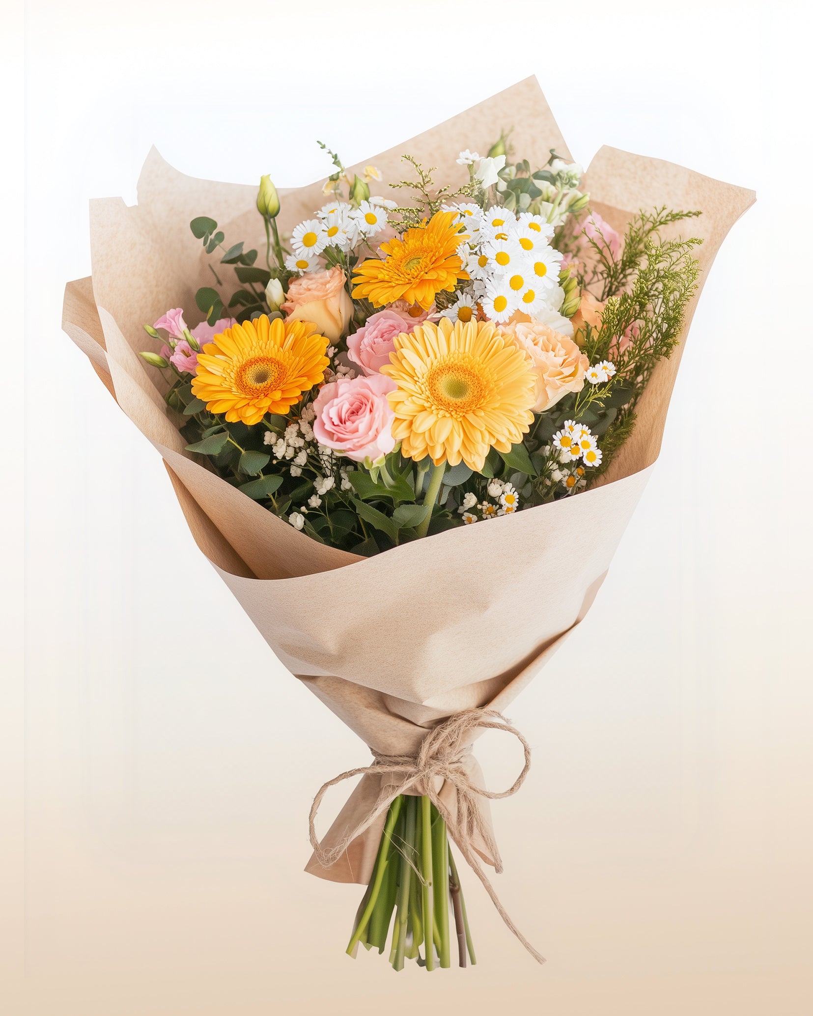 Sonnige Energie in Blumenform: 3 gelbe Gerbera, 2 rosa Rosen, 2 weiße oder pastellfarbene Rosen, Kamille und grünes Laub. Ein Strauß, der Licht, Wärme und Freude bringt.
