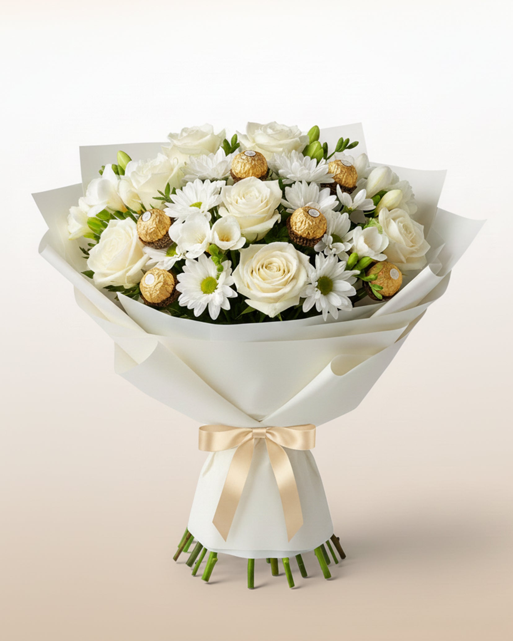 Ein Arrangement für einen ruhigen und stilvollen Jahresbeginn. Weiße Saisonblumen, dezente Akzente und Pralinen ergeben ein elegantes und zeitloses Geschenk.