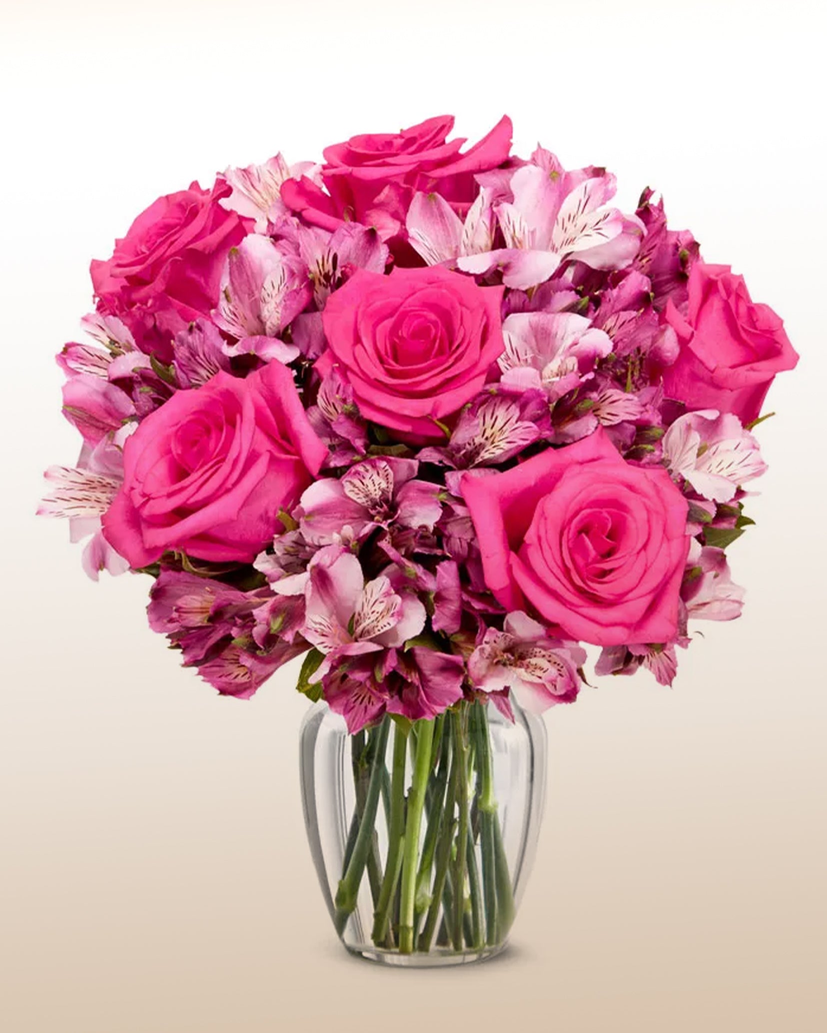 Une caresse en forme de fleurs. Ce délicat bouquet associe des roses roses et des alstroemères dans un élégant vase en verre, conçu pour transmettre affection, gratitude ou simplement illuminer la journée de quelqu’un de spécial.