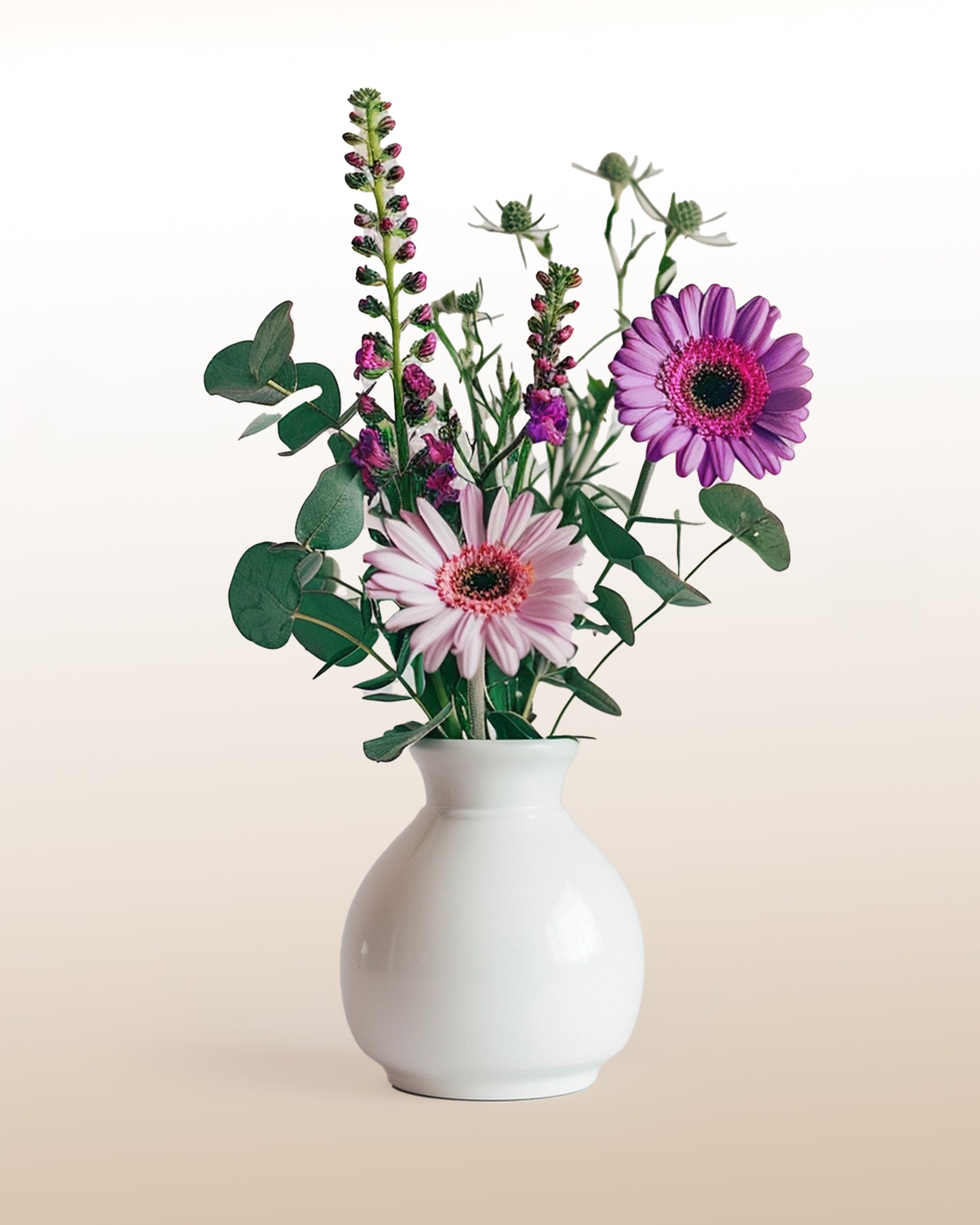 La imagen es referencial. El tipo de flor y el color puede variar de acuerdo a la disponibilidad. También el tipo de florero.