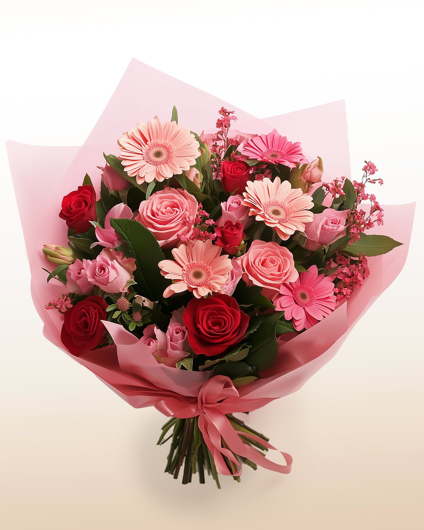 Suave pero imposible de ignorar. Este ramo reúne 6 gerberas en tonos rosados, 3 rosas rojas y 3 rosadas, envueltas en follaje verde que realza su dulzura natural. El resultado: un efecto inmediato de ternura y estilo. Perfecto para expresar cariño con belleza y naturalidad.