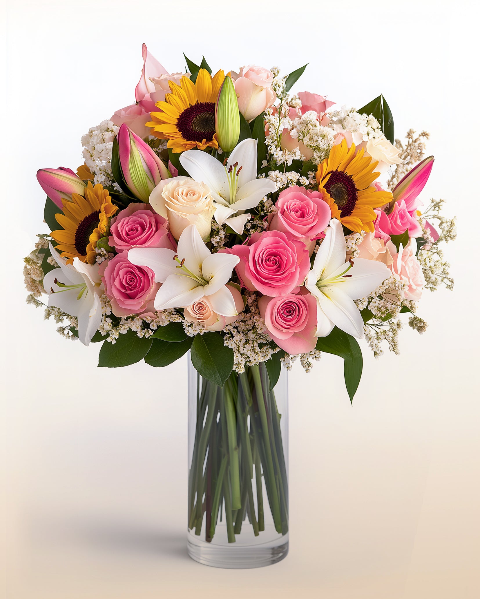 Cuando todo sale bien desde el primer vistazo. Este ramo mezcla 3 girasoles, 8 rosas en tonos pastel, 6 lirios blancos o rosados, follaje verde y gypsofilia. Elegante, fresco y equilibrado: el regalo que nunca falla.