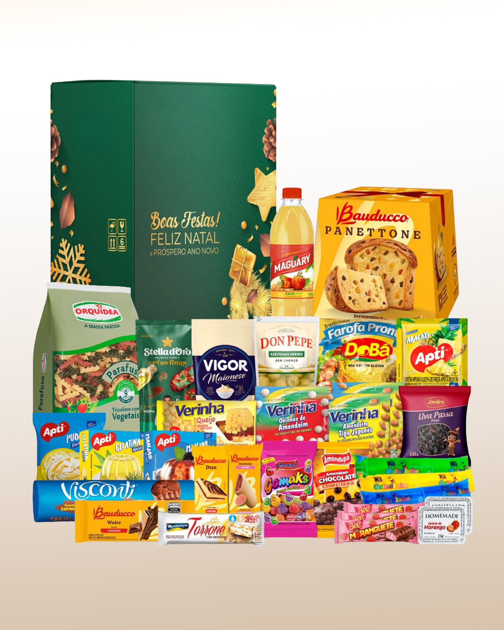 • Panettone Tradicional Bauducco 400 g: Suave, esponjoso y perfecto para compartir. • Jugo concentrado de naranja o cajú Maguary / Serigy 500 ml: Refrescante y práctico para cualquier comida. • Pasta Tricolor Orquídea / Da Roz 200 g: Colorida y lista para un plato especial. • Aceitunas verdes Don Pepe / Andaluzia 50 g: El toque salado que nunca falla. • Uvas pasas sin semillas Don Pepe / Jandira 100 g: Dulces y clásicas en la mesa navideña. • Maní japonés Verinha / Amendupã (2 unidades de 30 g): Crocante y lleno de sabor. • Turrón con maní Montevérgine / Santo Antônio 45 g: Tradicional e infaltable en estas fechas. • Farofa condimentada Dobá / Maní 180 g: Ideal para acompañar cualquier plato. • Snack de queso Verinha 50 g: Crocante, sabroso y perfecto para picar. • Premezcla para pudín Apti 40 g: Un postre fácil con sabor casero. • Galleta rellena de chocolate Visconti 125 g: Dulce y perfecta para compartir. • Huevitos de maní Verinha 30 g: Dulces y crocantes, un clásico. • Mermeladas Homemade (2 unidades de 10 g): Ideal para panes o postres. • Premezcla de gelatina Apti / Lual 20 g: Práctica y muy rendidora. • Moranguete sabor fresa Bel (3 unidades de 9 g): Dulce tradicional y favorito de muchos. • Maxi goiabinha Bauducco 30 g: Relleno de guayaba, perfecto para un antojo rápido. • Maní cubierto de chocolate Amendupã / Kuky 30 g: Dulce, crocante y delicioso. • Pan de miel cubierto con chocolate Bauducco 30 g: Un clásico navideño irresistible. • Galleta wafer chocolate Bauducco 30 g: Crocante y con sabor intenso. • Salsa de hierbas finas Stella D’Oro / Olé 300 g: Ideal para ensaladas y acompañamientos. • Premezcla para manjar Apti 50 g: Sabor tradicional listo para preparar. • Mini pastel de chocolate Bauducco / Santa Edwiges 27 g: Perfecto para un antojo dulce. • Mayonesa tradicional Vigor / DuSul 200 g: Para realzar cualquier receta navideña. • Gomitas Dori / Amendupã 30 g: Suaves y coloridas. • Geladinho Americano Emilia (3 unidades): Refrescante y perfecto para días cálidos. • Refresco en polvo Apti / Lual 20 g: Para preparar al instante. • Caja decorada Navidad “Premium” con asa: Presentación elegante, lista para regalar.
