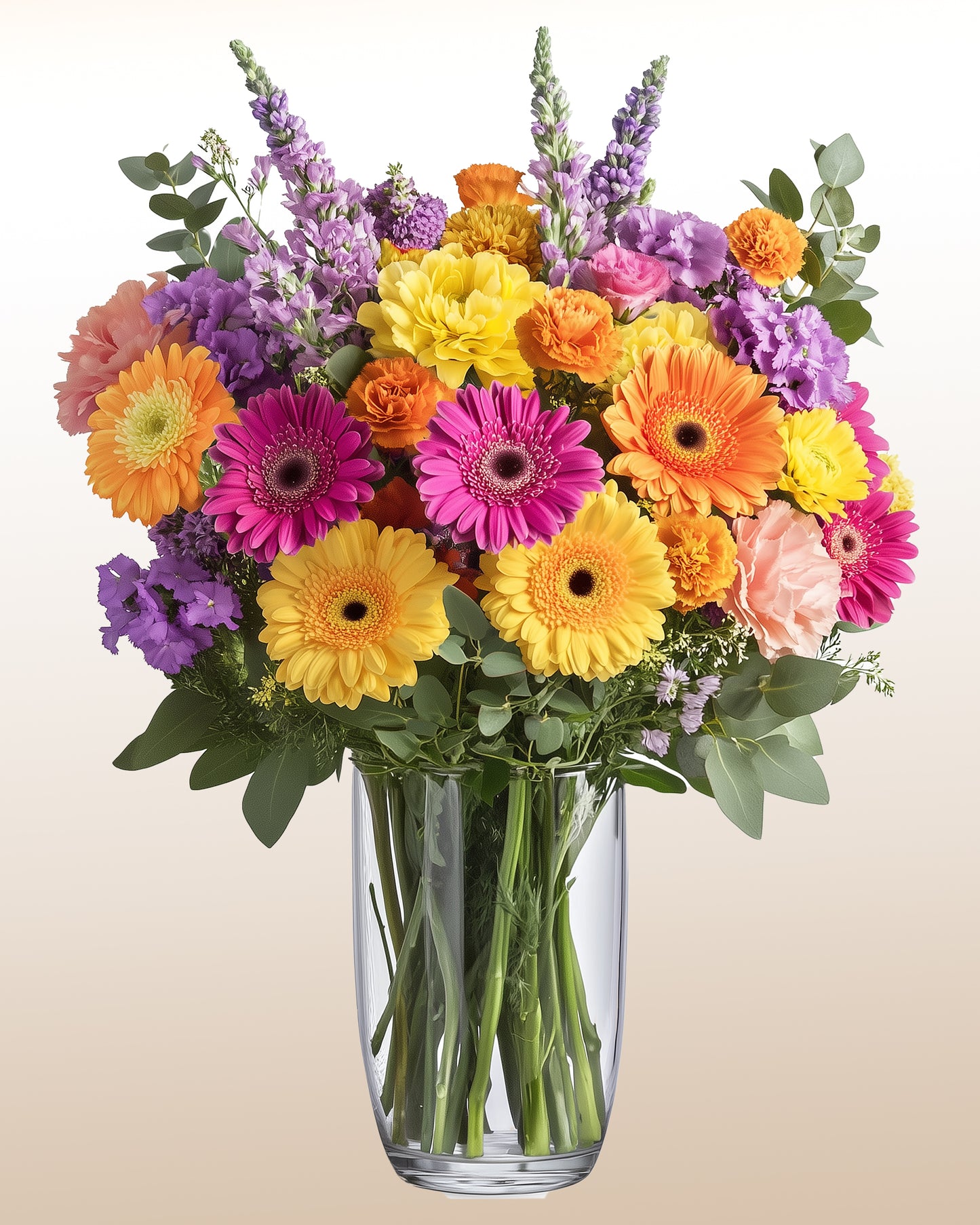 Um arranjo vibrante que celebra a vida em todos os seus tons: 12 gérberas multicoloridas e flores mistas numa composição cheia de entusiasmo e frescor.