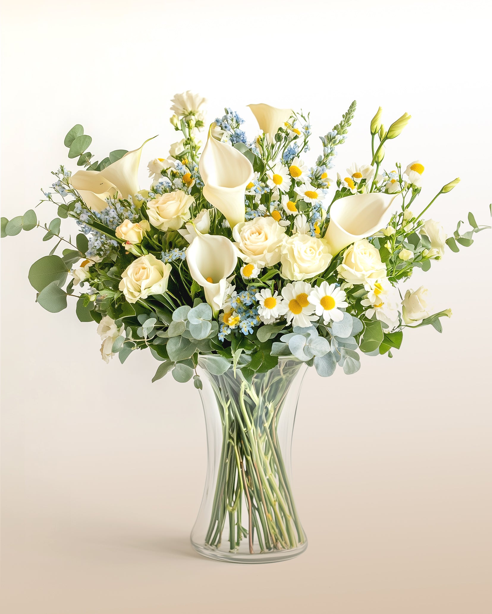 Um arranjo em vaso que celebra a elegância: 6 lírios-do-nilo, rosas e camomila numa combinação fresca e refinada. Perfeito para expressar carinho, admiração ou gratidão.
